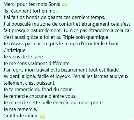 → Oui. C’est aussi ce qui différencie le Triple Soin Quantique, d’un soin énergétique traditionnel. Je t’accompagne tout au long de ces 9 jours. Je réponds à tes questions, fais des libérations sur tes blocages et je poste des guidances, des enseignements. Et je t’accompagne dans tes prises de conscience.