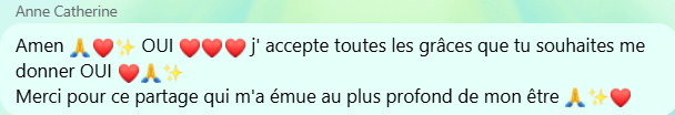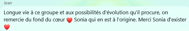 Chaque participant est invité à partager sur le groupe Messenger ce qui se passe pour lui et mes "éclairages" et enseignements spirituels accompagne sa conscience à monter encore plus haut.